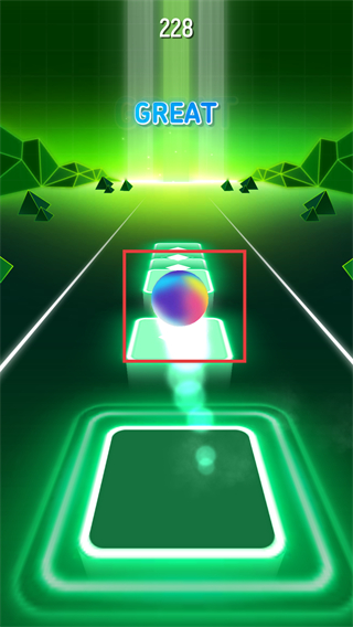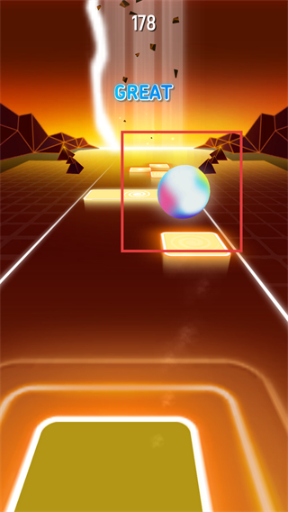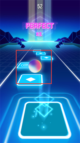 1、控制球体落在【蓝色菱形方块】上,保持节奏获取【PERFECT】评价,积累分数推进关卡。