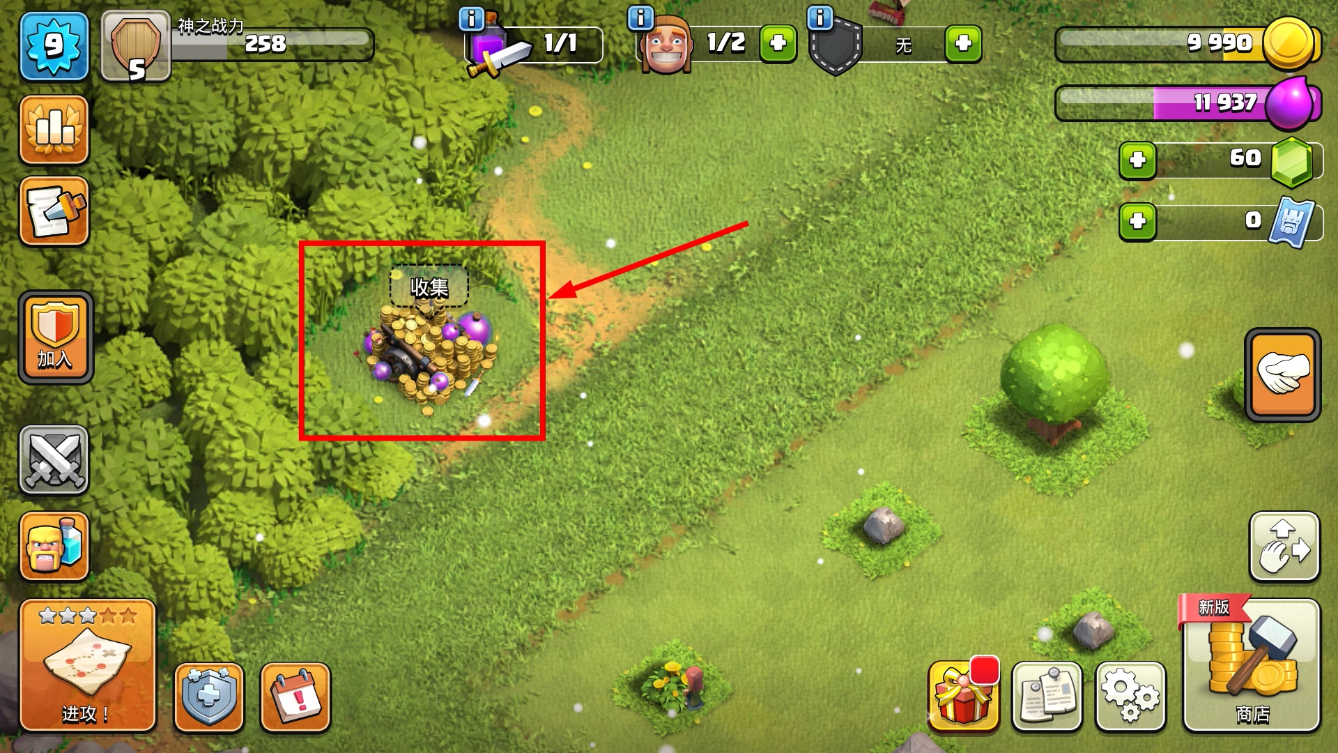 1、收集地图上的【金币】-【圣水】资源堆,及时获取资源可支撑后续建筑升级与军队训练,提升基地发展效率。