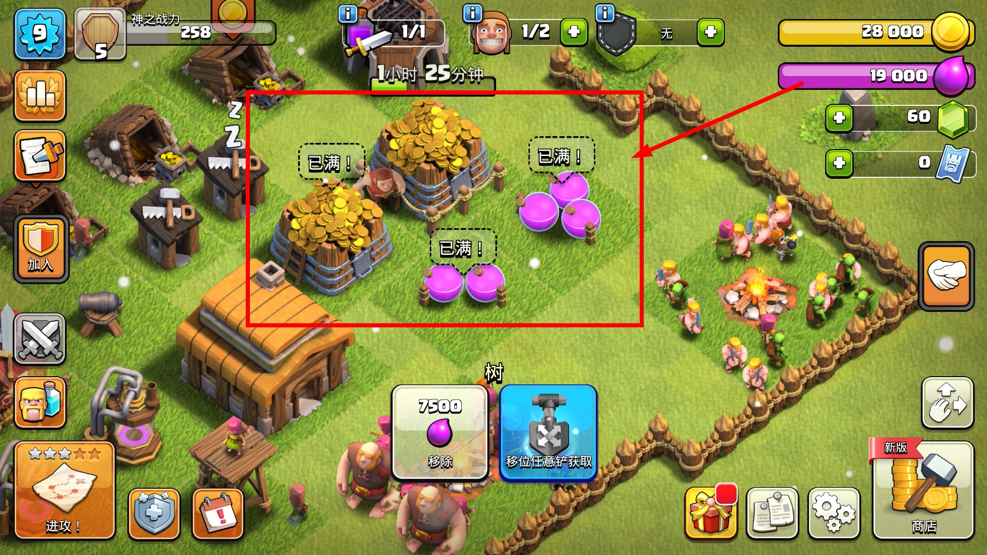 2、当【金币】-【圣水】仓库显示已满时,需优先升级仓库或消耗资源,避免浪费影响基地存储与生产节奏。