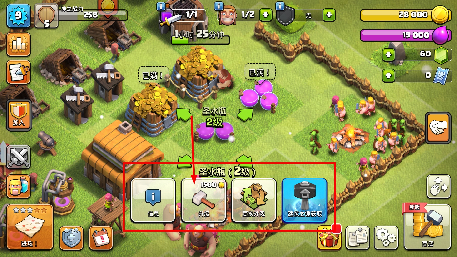 3、点击【圣水瓶】打开操作菜单,选择【升级】消耗【1500】【金币】,提升圣水存储容量满足后续需求。