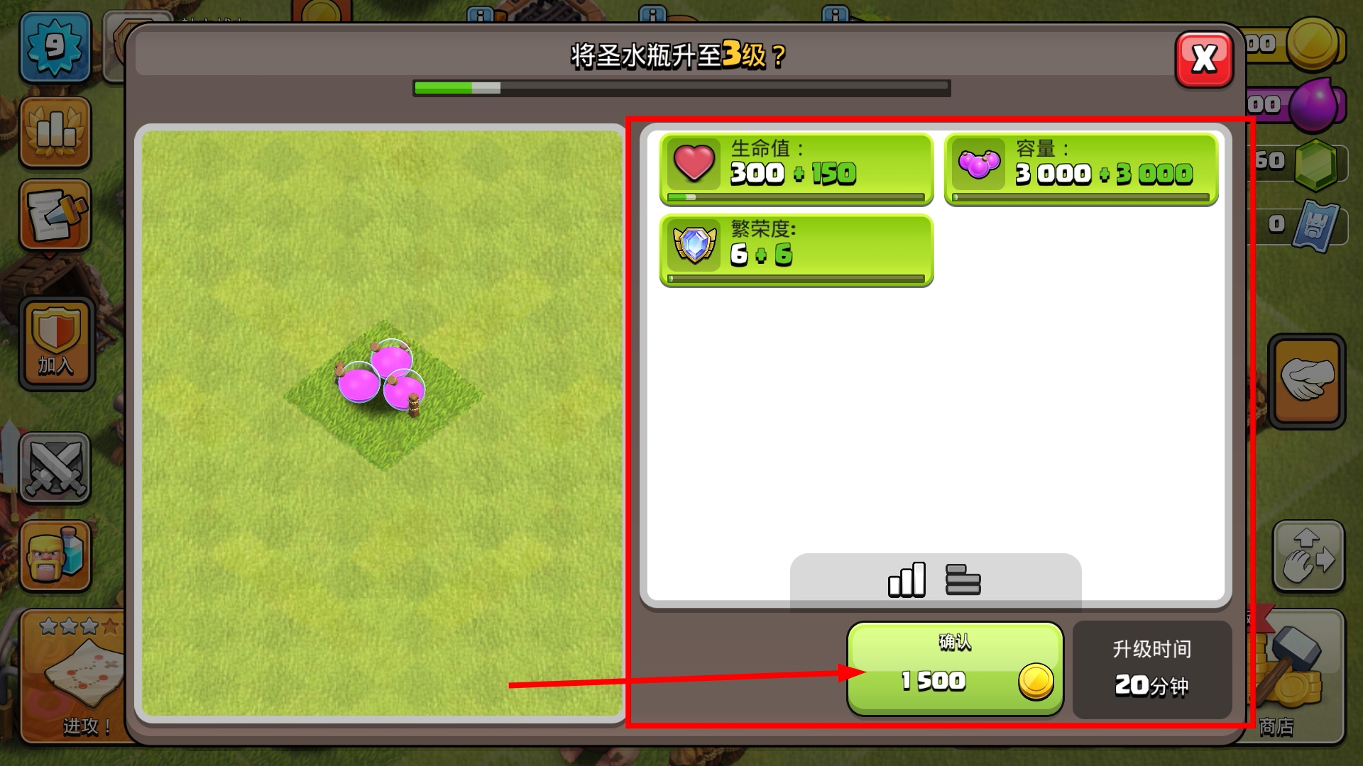 4、升级【圣水瓶】至3级可提升【生命值】-【容量】-【繁荣度】,确认消耗【1500】【金币】等待20分钟完成。