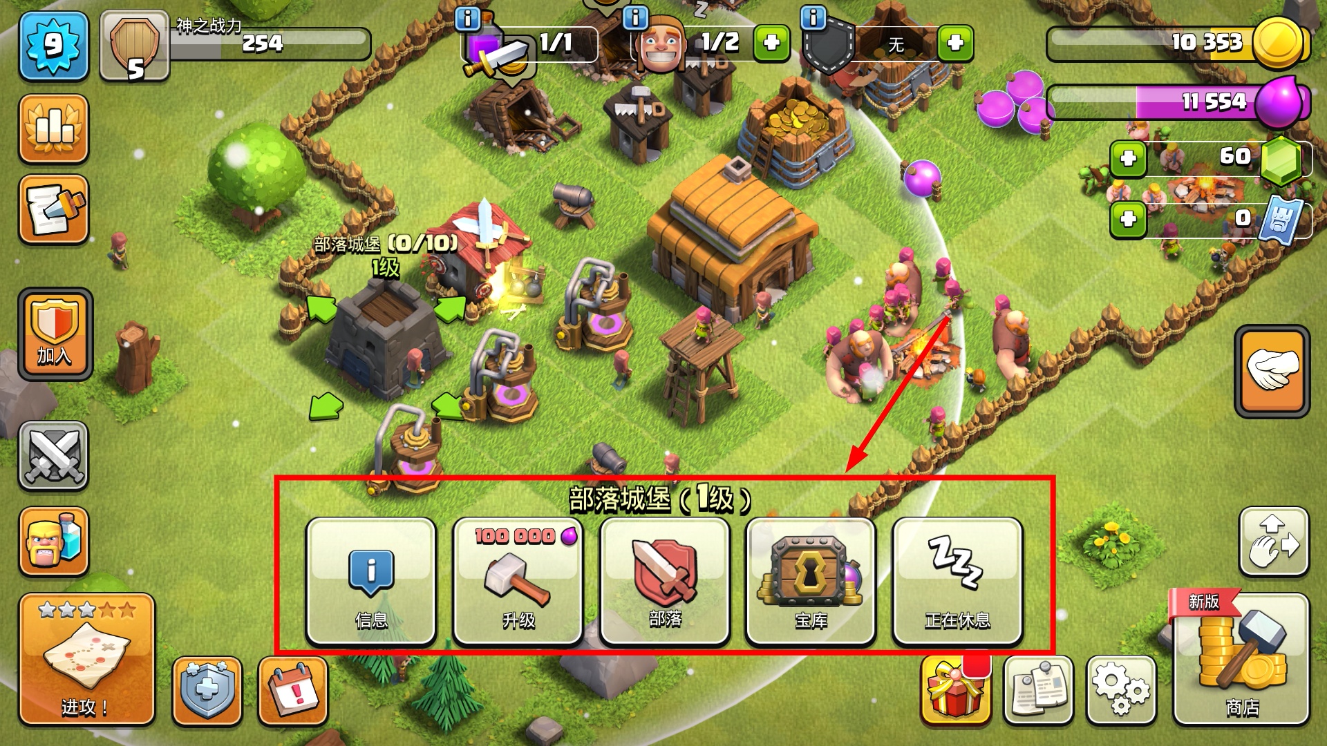1、部落城堡界面有信息、升级等功能,可查看详情、提升等级,还能管理部落和宝库,合理利用能优化城堡运营。
