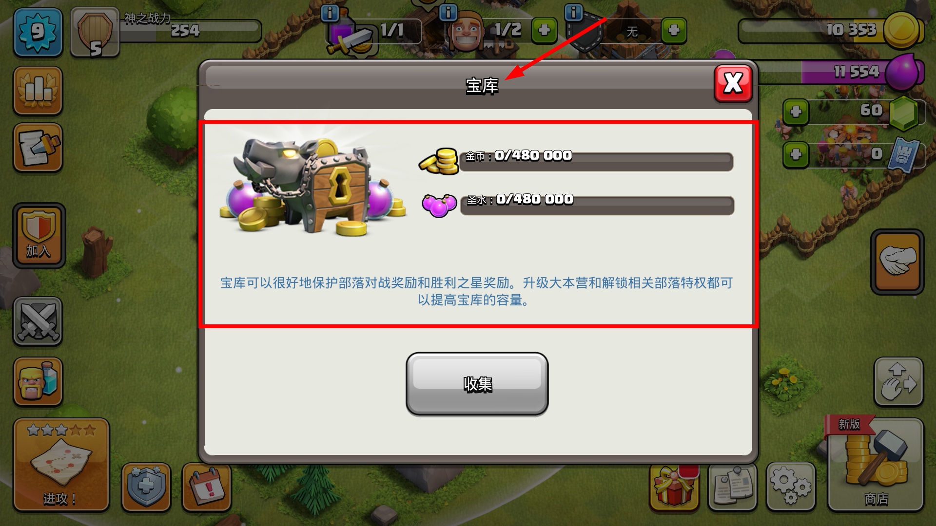 2、宝库可保护对战和胜利之星奖励,当前金币圣水容量各48万,升级大本营或解锁特权能提高存储上限。