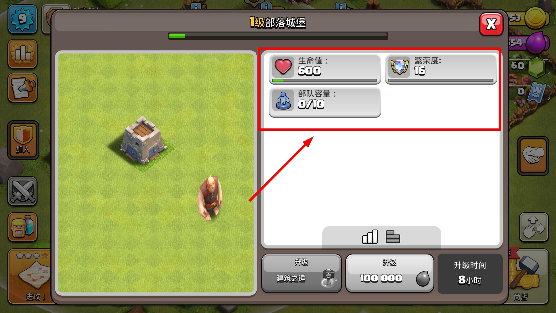 3、1级部落城堡生命值600,繁荣度16,部队容量0/10,了解这些属性可规划城堡发展与部队配置。