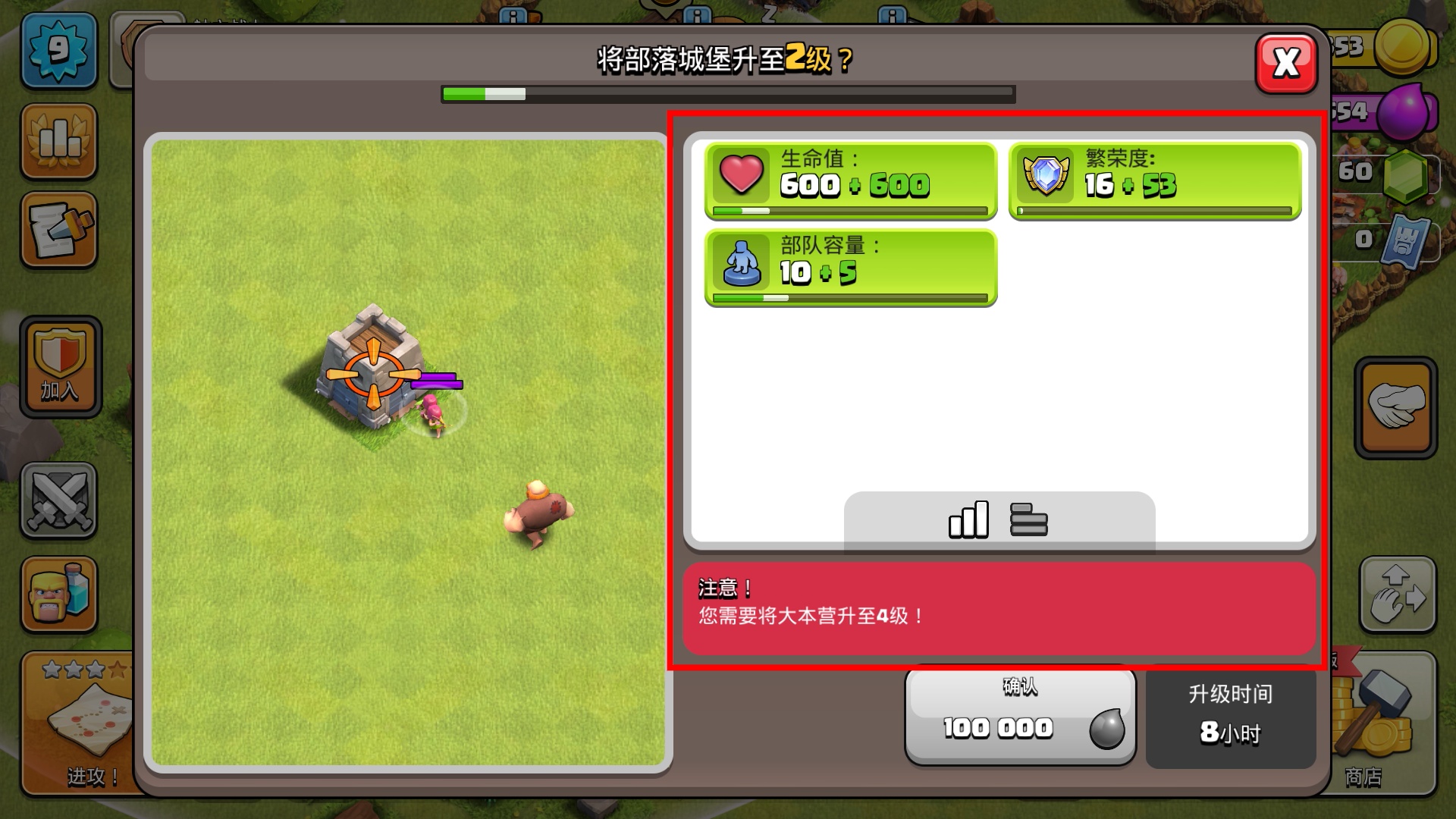 4、升级部落城堡到2级能提升生命值、繁荣度和部队容量,但需先升大本营至4级,满足条件后可增强实力。