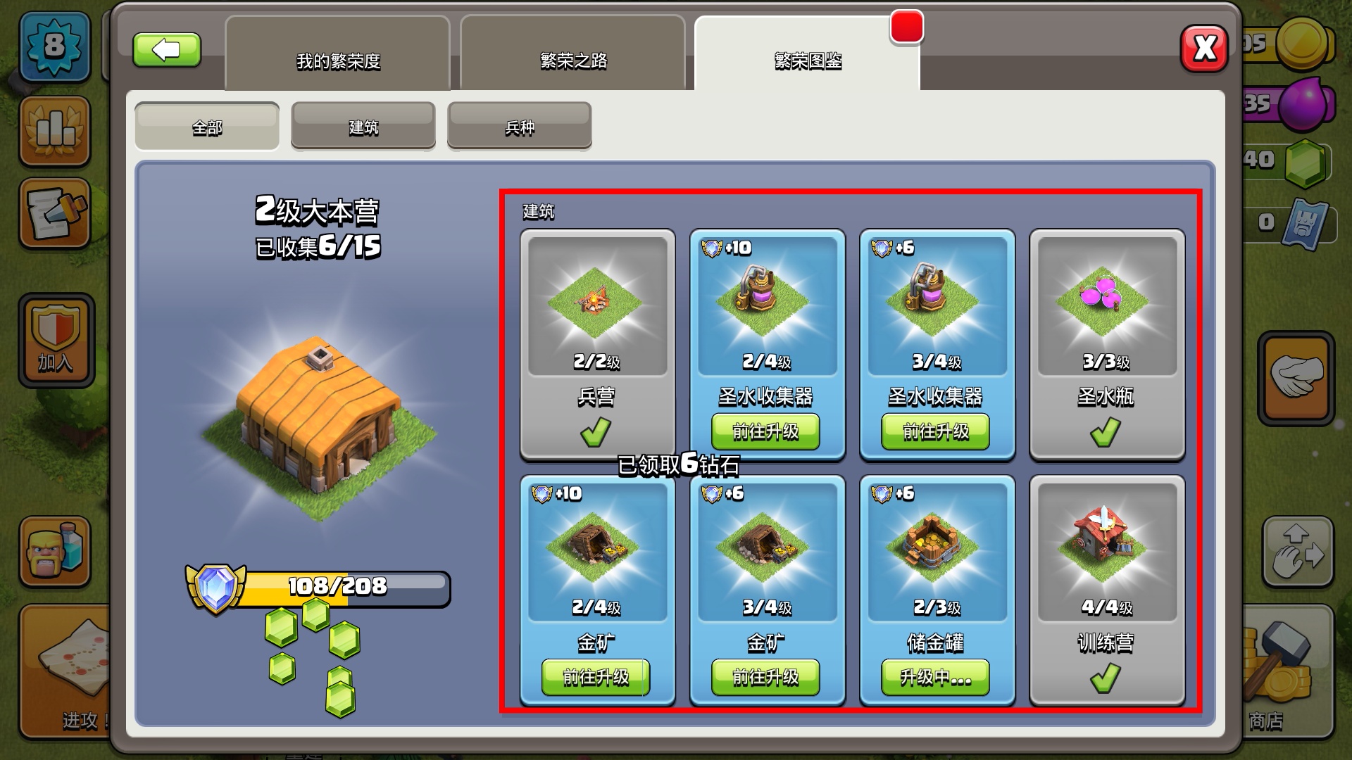 2、查看【2级大本营】的建筑收集情况,完成兵营、圣水收集器等建筑要求,可领取钻石并推进大本营升级进度。