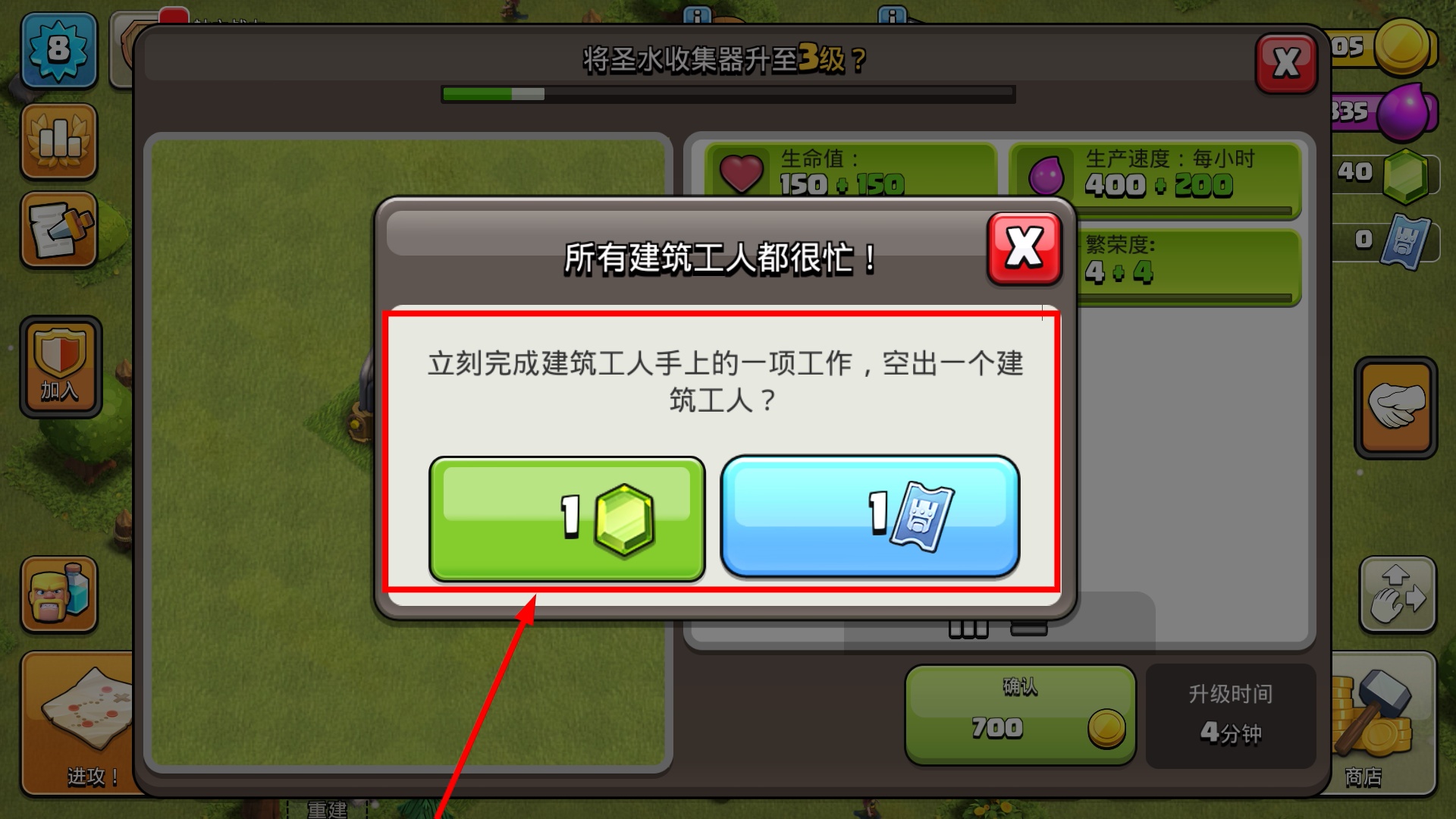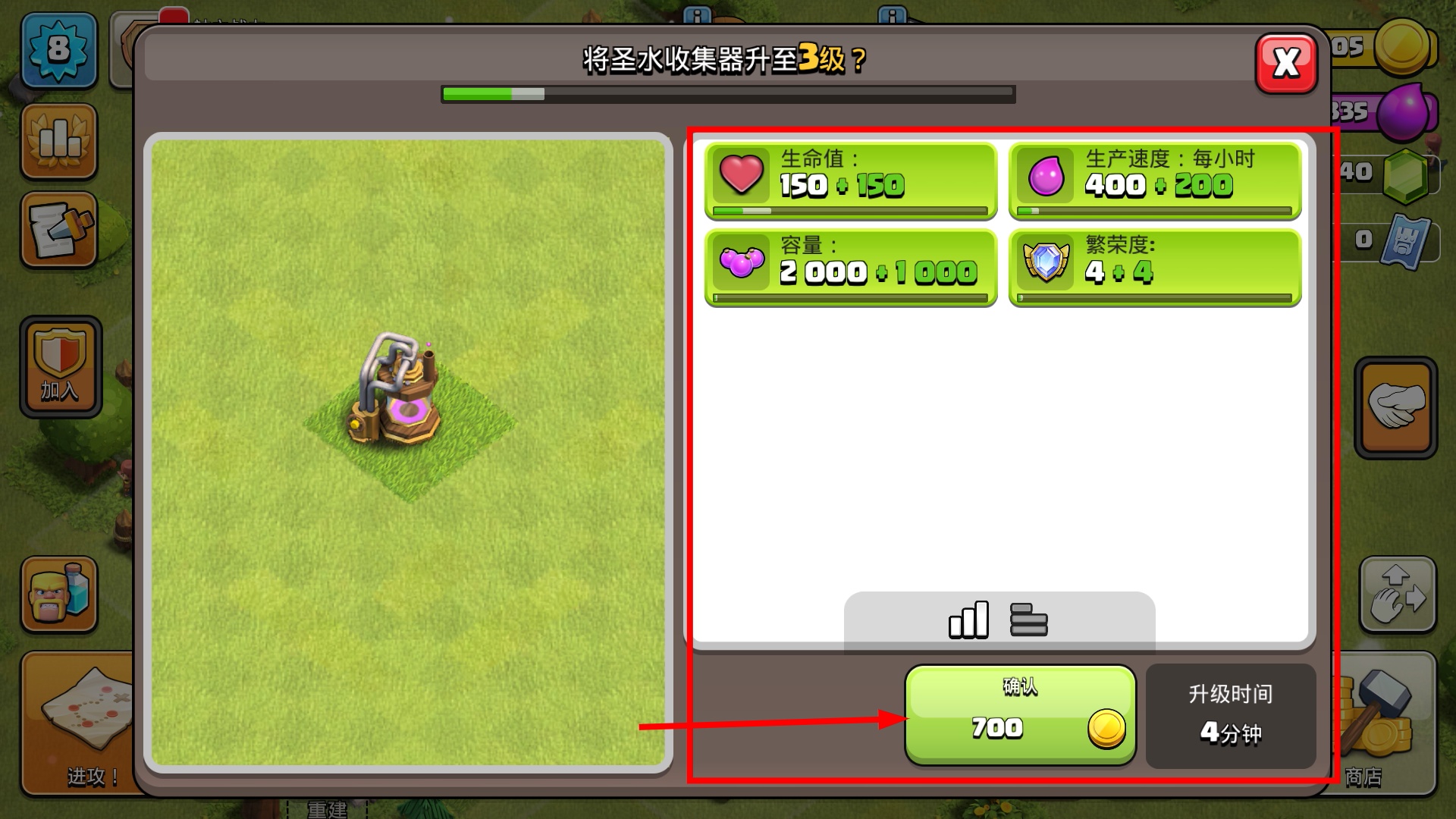 3、升级【圣水收集器】至3级,能提升生命值、生产速度与容量,消耗700金币且耗时4分钟,可增加繁荣度。