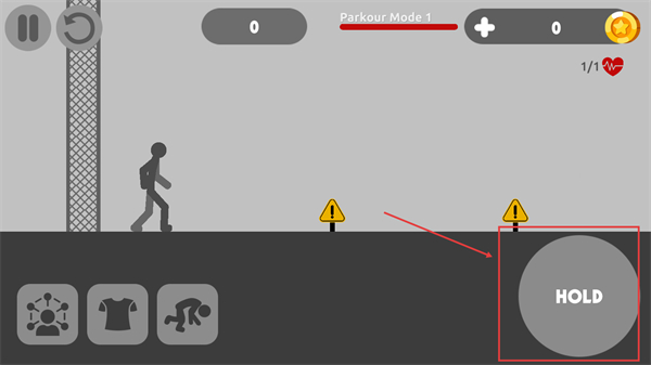 2、在【ParkourMode1】长按【HOLD】按钮,操控火柴人前进,避开障碍保持生命值完成关卡。