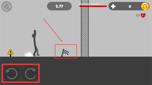3、使用左右翻转按钮控制火柴人动作,跨越障碍冲向【终点旗帜】,完成跑酷关卡的挑战。