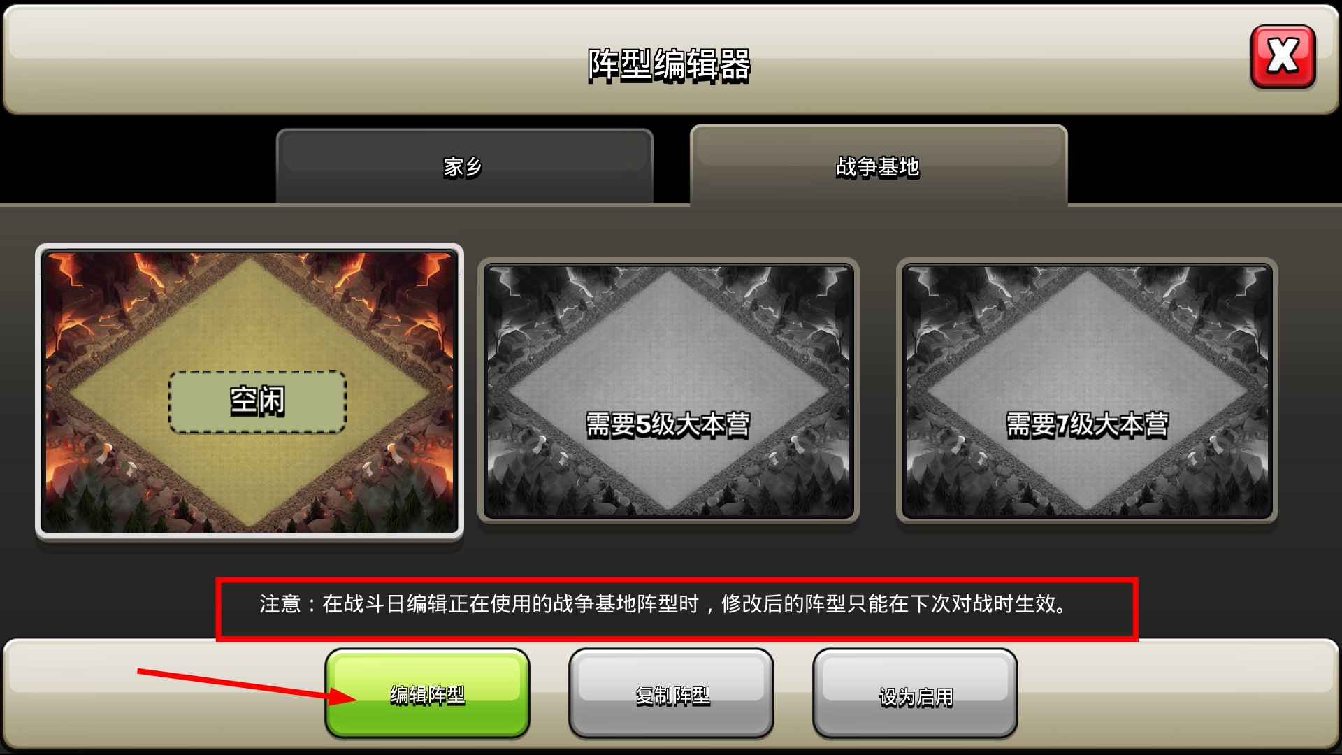 1、从阵型编辑器的【空闲】阵地选择后点击【编辑阵型】,开始调整战争基地布局,战斗日修改的阵型需下次对战生效。