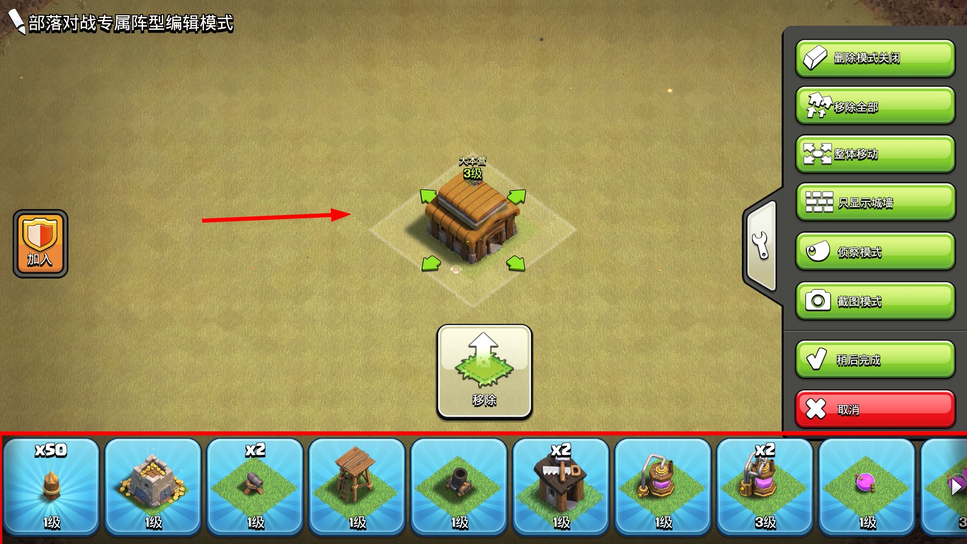 2、进入编辑模式后拖动【大本营-3级】到合适位置,搭配下方【12级】【1级】建筑布置基础防御框架。