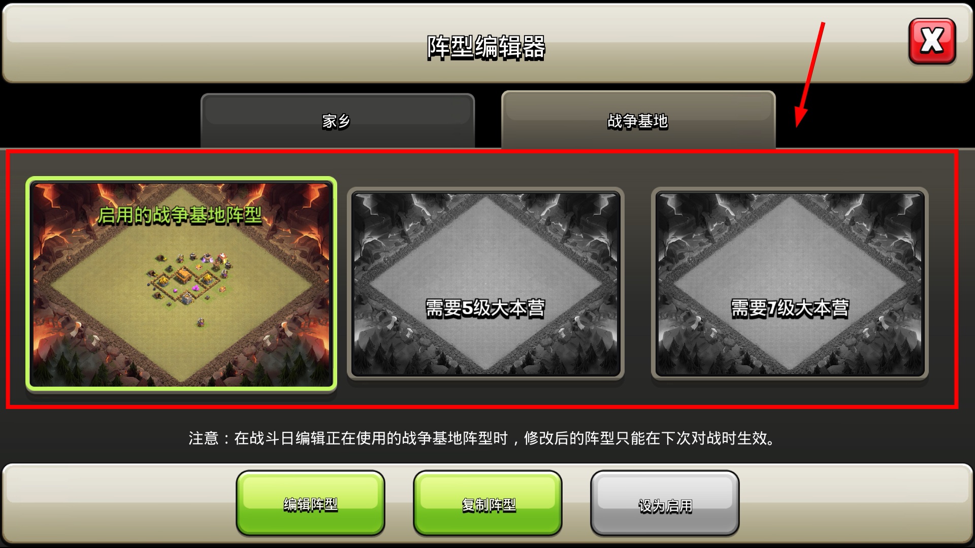 4、回到阵型编辑器确认【启用的战争基地阵型】已更新,若需复用可点击【复制阵型】留存当前布局。