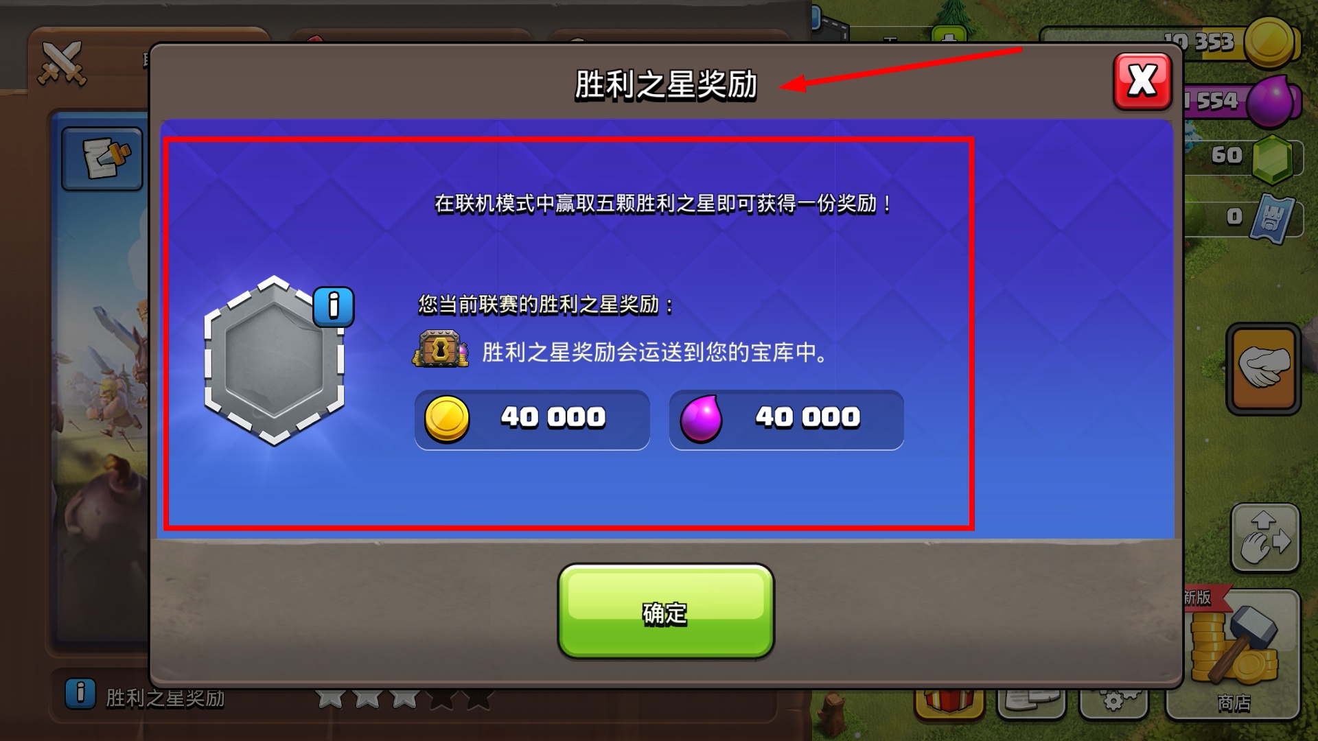 4、联机模式中赢取五颗胜利之星可获得奖励,当前联赛奖励会送到宝库,包含金币和圣水各四万的资源。
