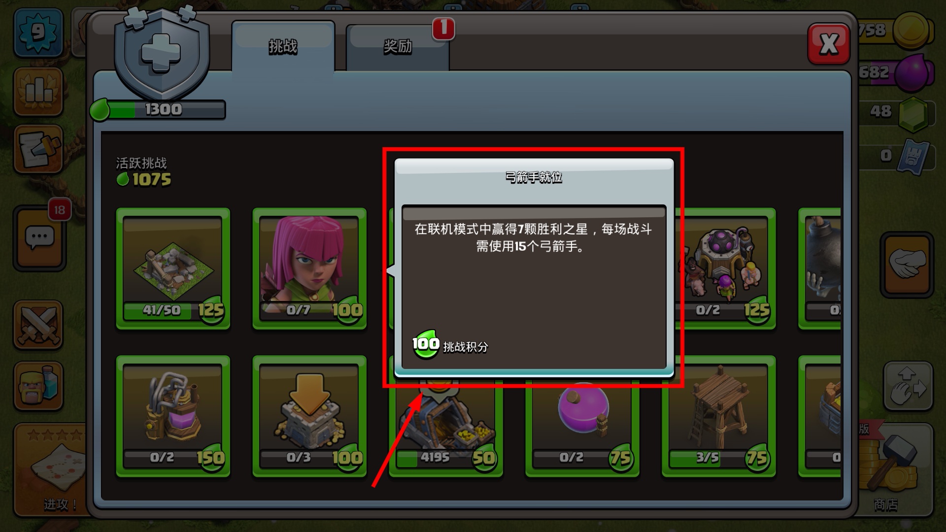 1、完成【弓箭手就位】任务可获【100】挑战积分,需联机赢【7】胜利之星且每场用【15】个弓箭手。