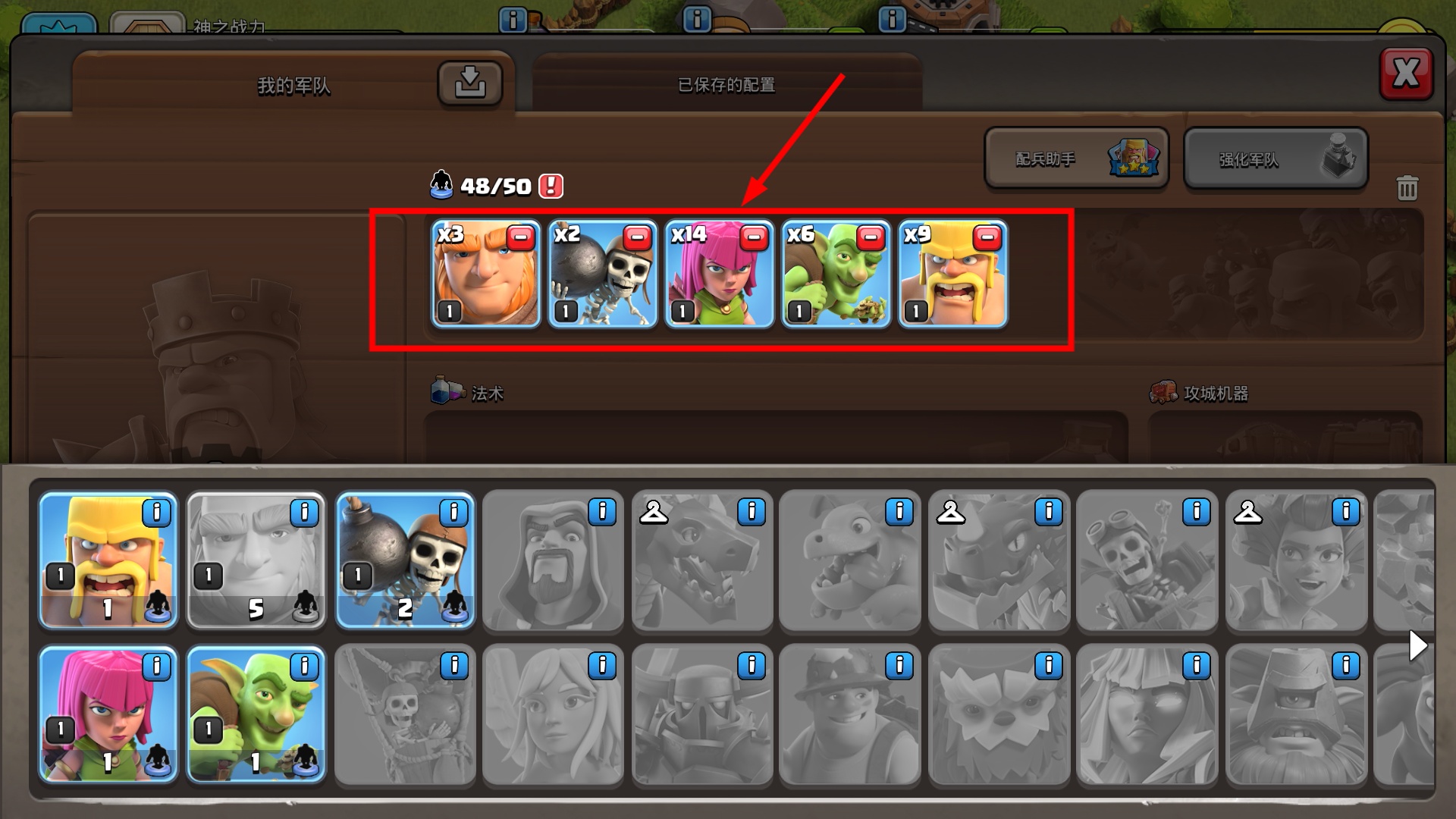 2、配置军队时确保【弓箭手】数量达标,结合【野蛮人】【炸弹人】等兵种,合理利用【50】人口空间。