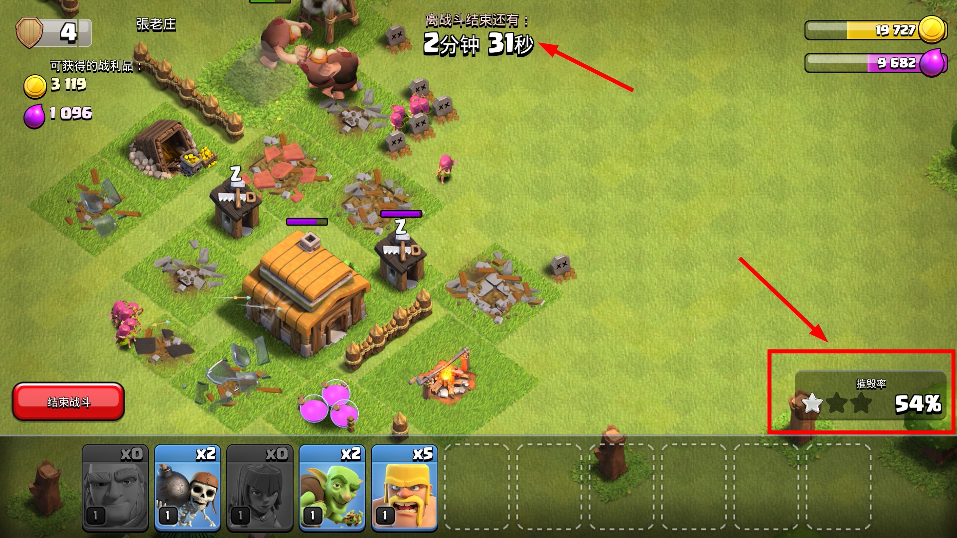 4、战斗时关注【摧毁率】进度,在剩余时间内破坏敌方建筑,达成任务所需的胜利之星目标。