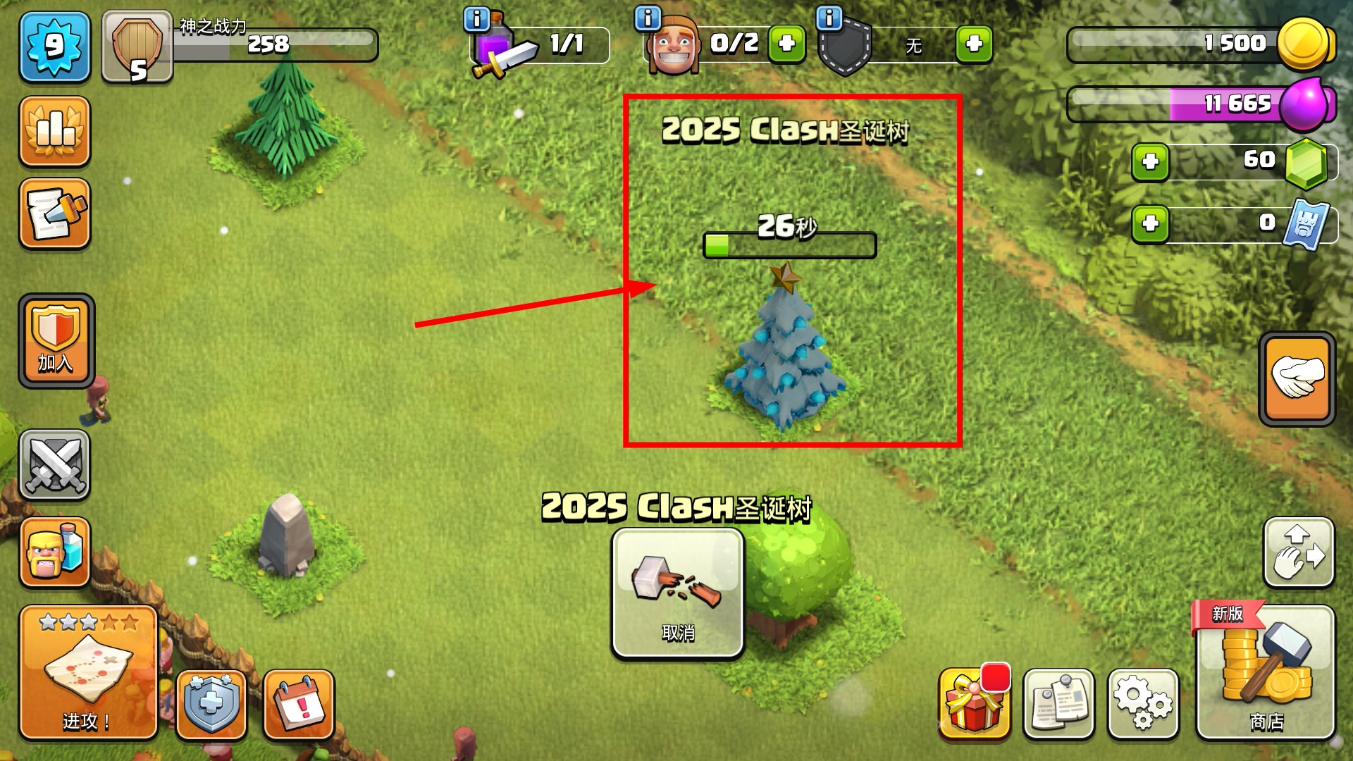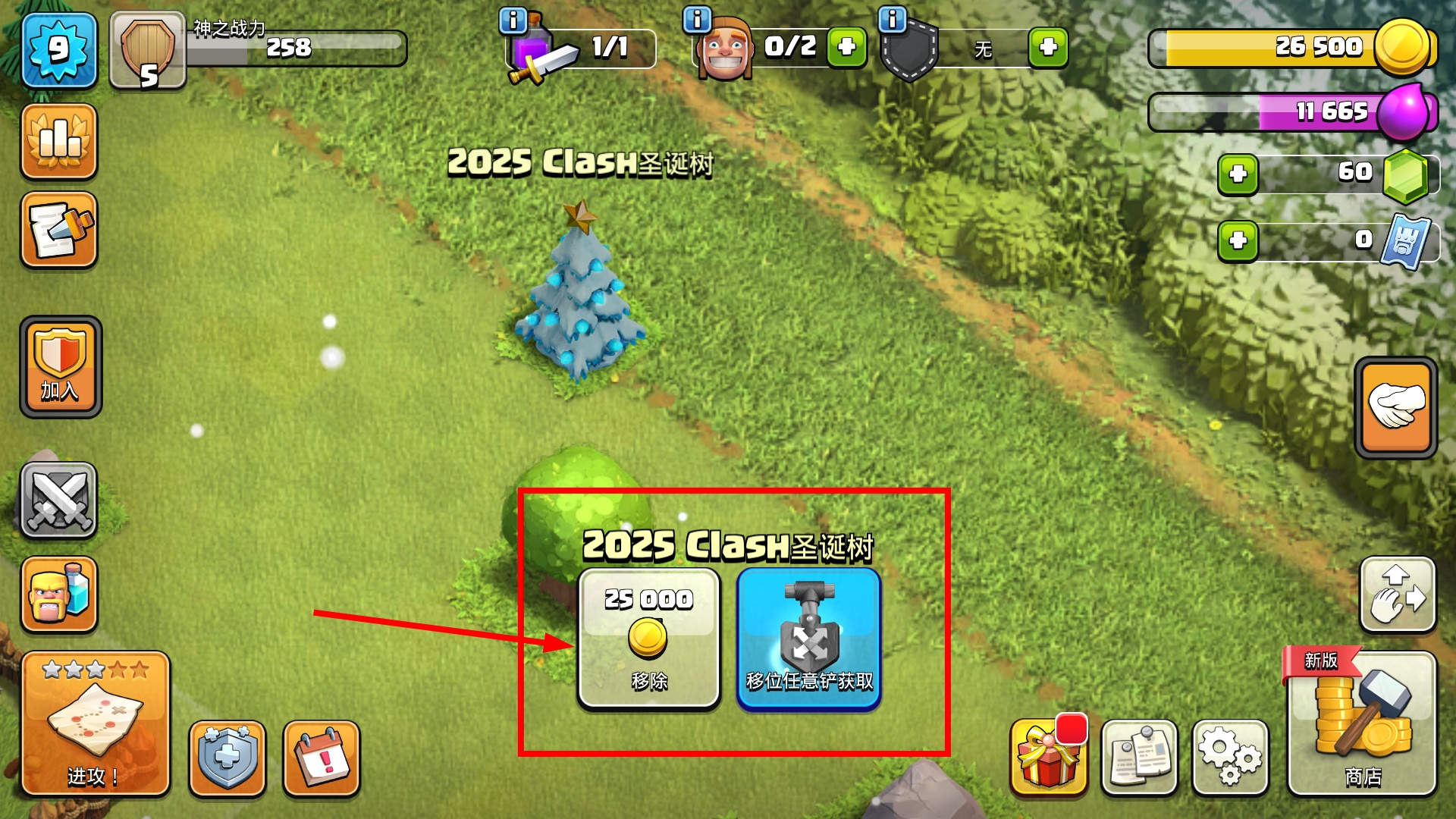 1、处理【2025Clash圣诞树】时,可消耗【25000】金币移除,或用移位铲获取,合理规划基地空间提升布局灵活性。