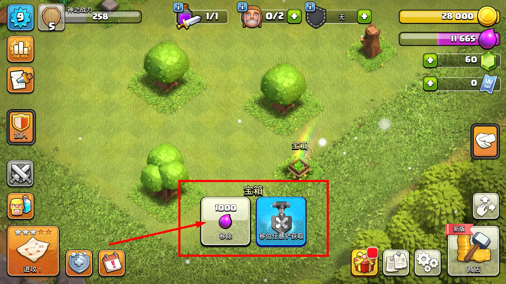 3、面对【宝箱】时,消耗【1000】圣水可移除它,或用移位铲获取,获取资源同时优化基地布局空间。
