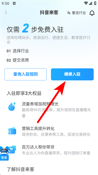 1、进入抖音来客的首页入驻界面,我们需要点击继续入驻。