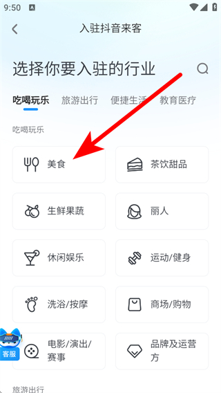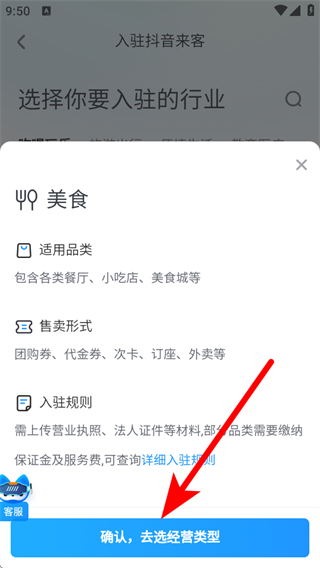 2、选择要入驻的行业如美食,点击确认,去选择经营类型。