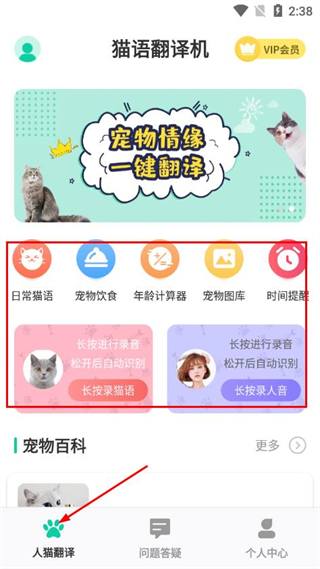 3、问题答疑板块可查看/提问养猫相关问题,个人中心提供使用帮助、联系客服等服务,还支持开通VIP会员。