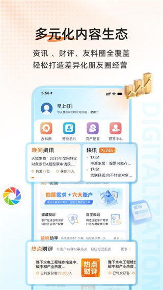 依托内容策略生产、多元资讯积累、智能名片获客、客户资源管理等功能,助力理财师拓客和服务客户的过程更加轻松顺利,提升整体工作效率与客户服务质量。