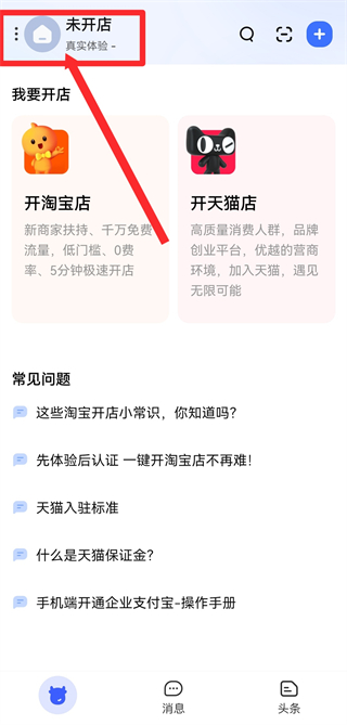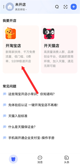 1、打开千牛APP,在首页点击开淘宝店,进入淘宝开店页面。