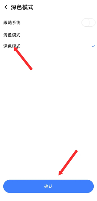 4、在深色模式设置页面,选择深色模式后点击确认,完成设置。