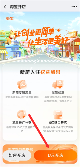 2、在淘宝开店的页面,点击0元开店,进入店铺类型选择界面。