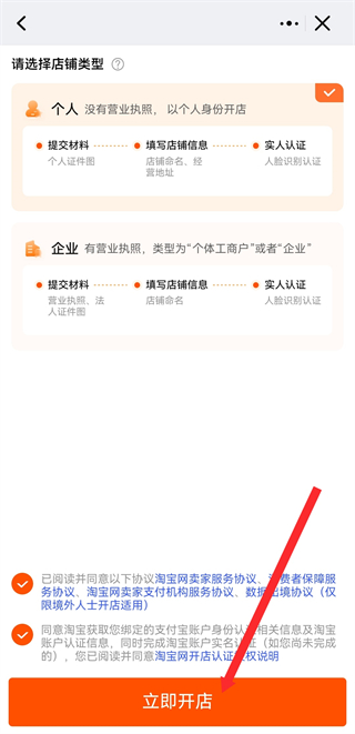 3、选择店铺类型,勾选同意协议后,点击立即开店,按照提示完成开店操作。