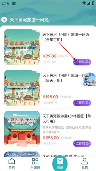 1、进入首页后,点击底部的商城选项,可进入旅游一码通商品列表页面。