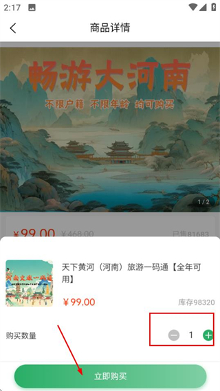 3、在商品详情页面,点击立即购买按钮,可进入购买数量选择页面。