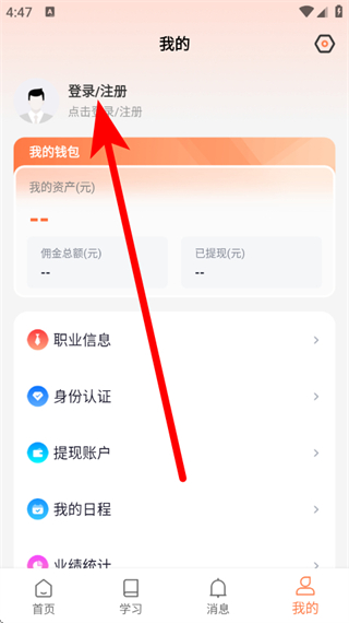 2、在我的页面,点击登录注册,进入登录注册界面。