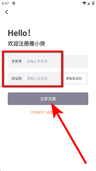5、在雁小侠注册页面,输入手机号和验证码,点击立即注册,完成注册。