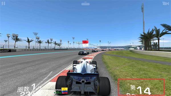 2、赛程中关注【圈数1/1】与排名【第14】,调整转向保持赛道内行驶,逐步提升速度。