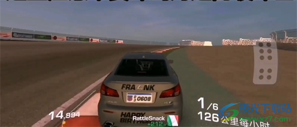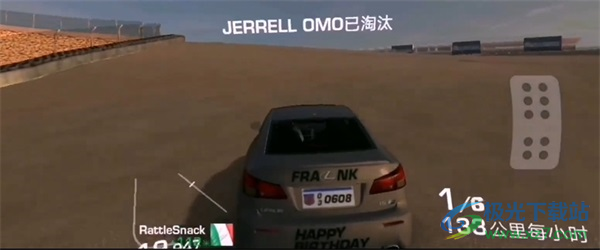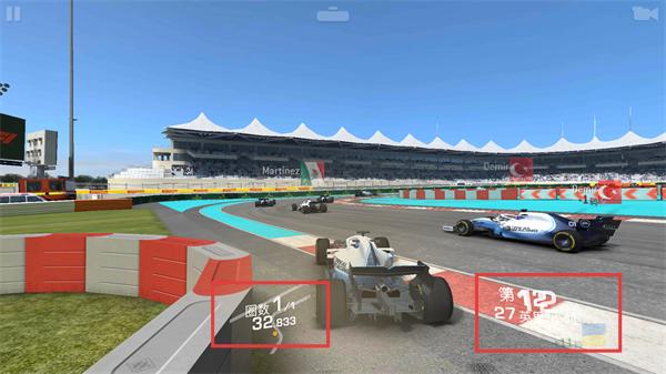 3、观察【圈数1/1-32.833】与【第12-27英里/小时】,在弯道区域精准操控,缩小与前车距离。