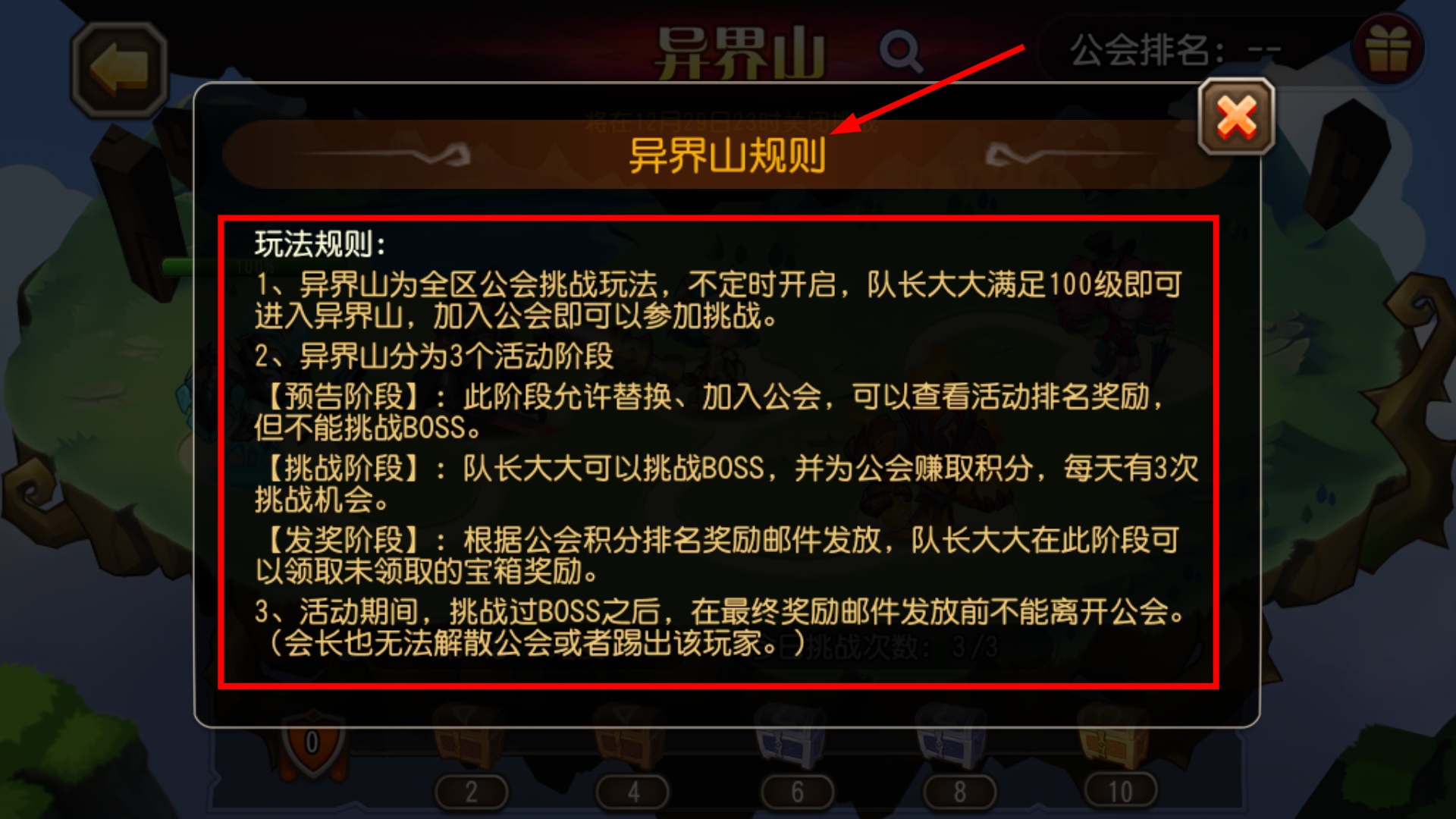 1、异界山为全区公会挑战玩法,100级可加入,分预告、挑战、发奖三阶段,挑战后不可离会需注意。