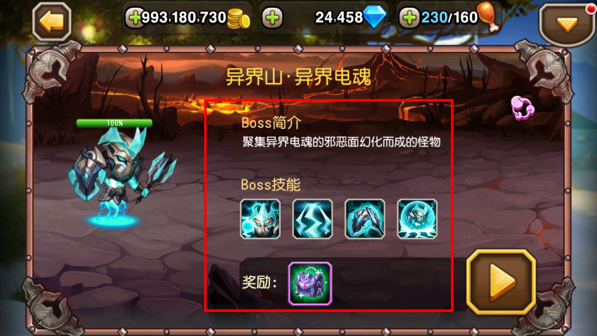 2、Boss为异界电魂邪恶面幻化,有四个技能,建议先查看简介与技能效果,为挑战做足准备。