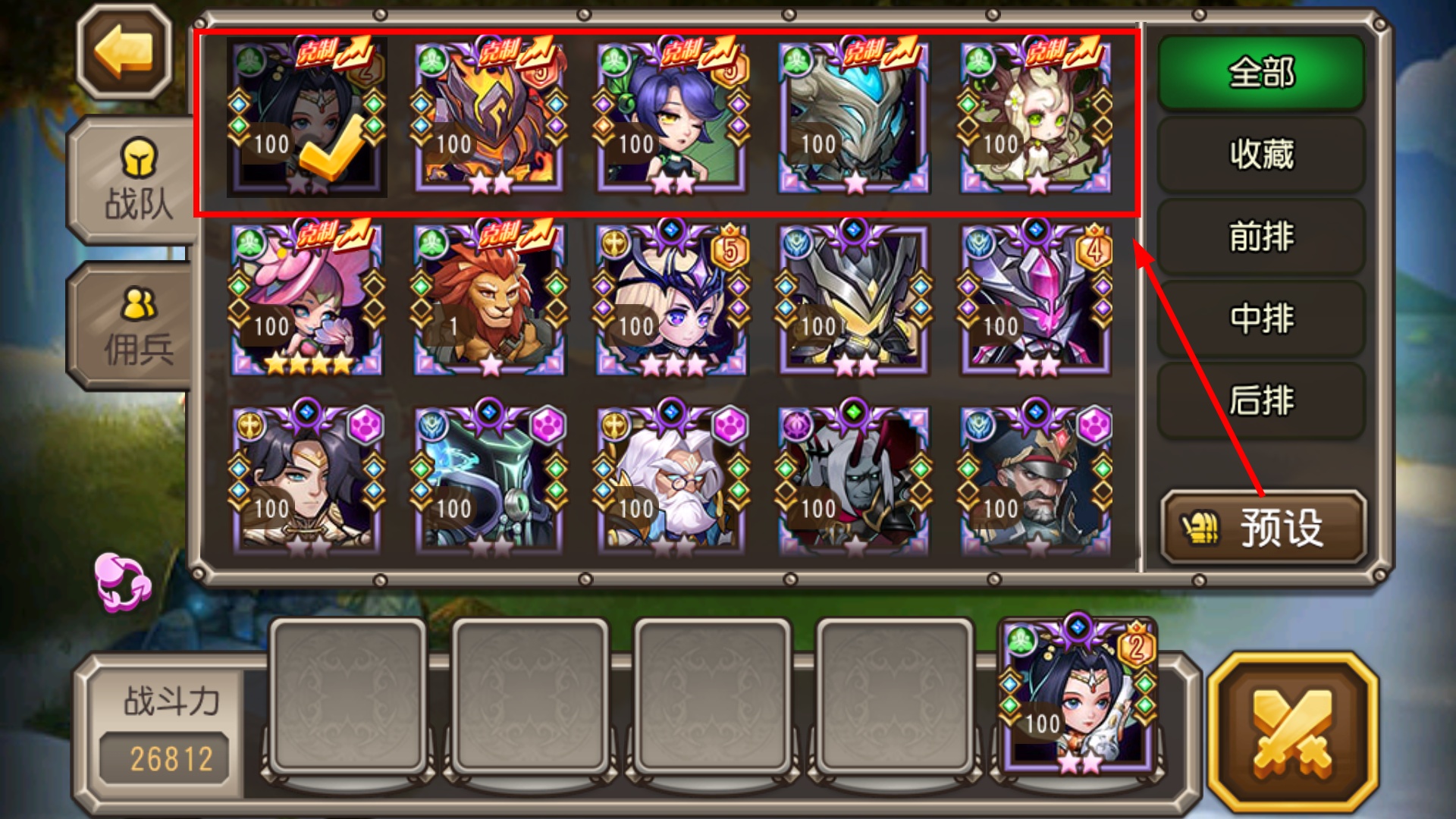 3、战队界面可选择100级英雄,按前排、中排、后排分类,合理搭配阵容能提升战斗效率。