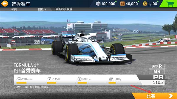 1、在【选择赛车】界面,选定【FORMULA1-F1·首秀赛车】后,点击【比赛】按钮进入赛程。