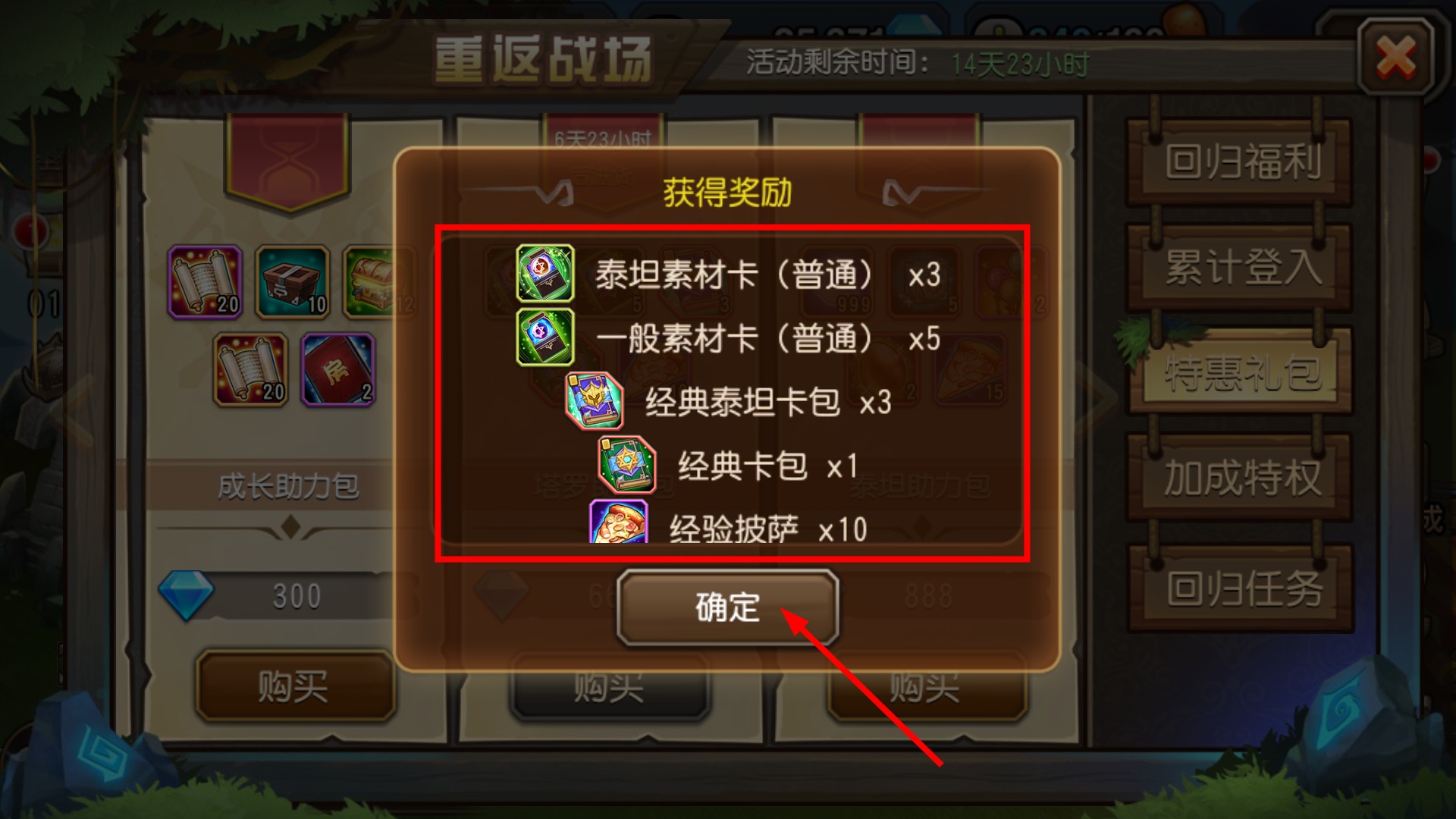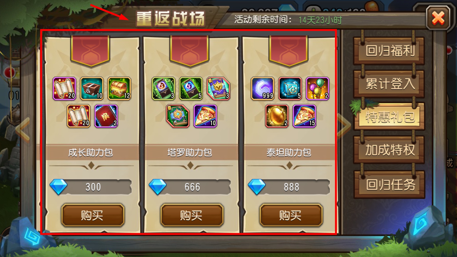 1、在【重返战场】活动中,消耗钻石购买【成长助力包】-【塔罗助力包】-【泰坦助力包】,获取资源助力成长。