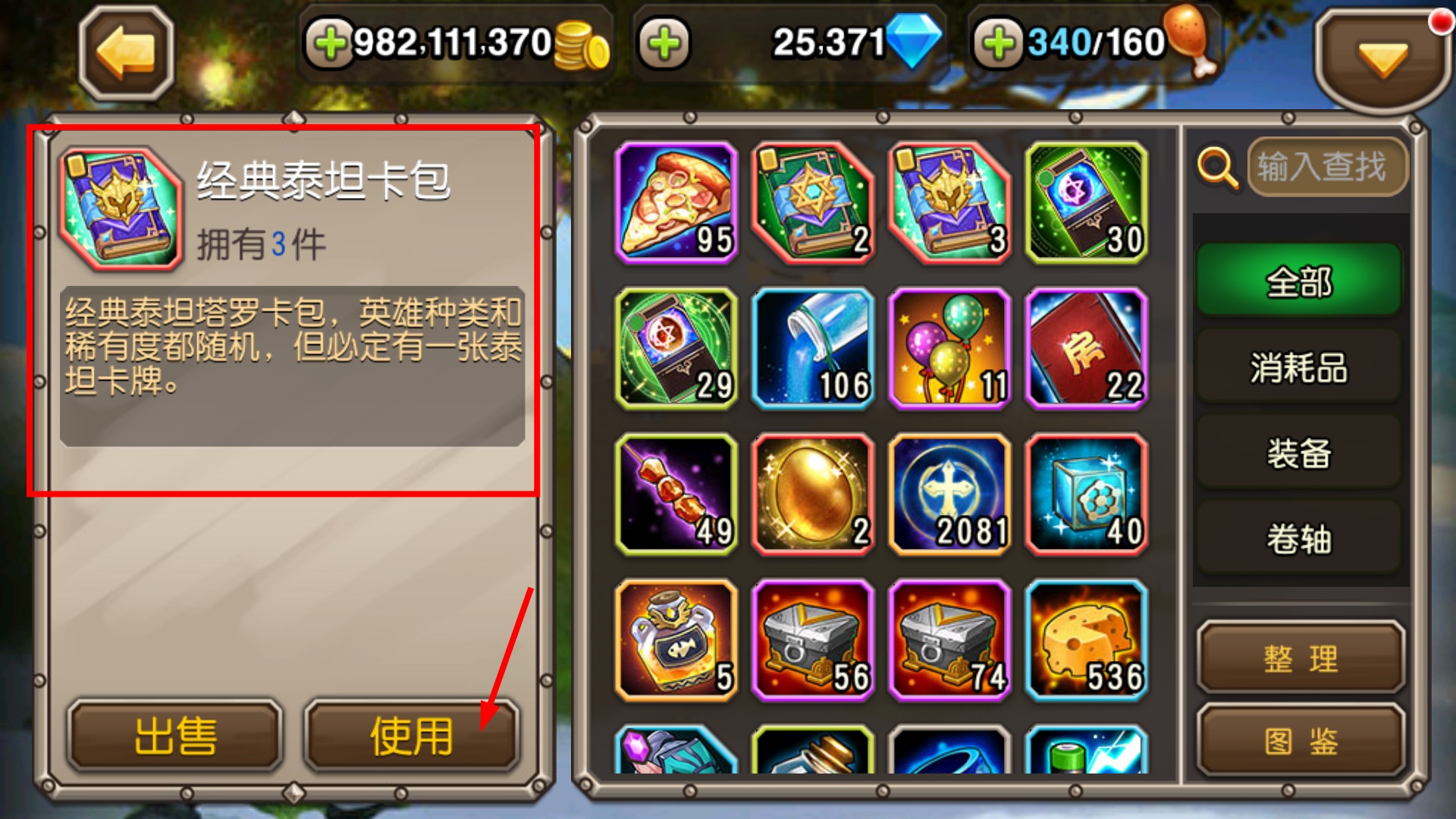 3、物品栏中【经典泰坦卡包】打开必得泰坦卡牌,点击使用即可抽取强力英雄。