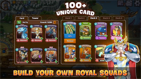2、卡牌+塔防双重玩法深度融合,核心围绕兵种卡牌展开对战,不同兵种卡牌拥有独特的攻击方式、防御属性与消耗能量,需根据战场局势与能量储备灵活投放。