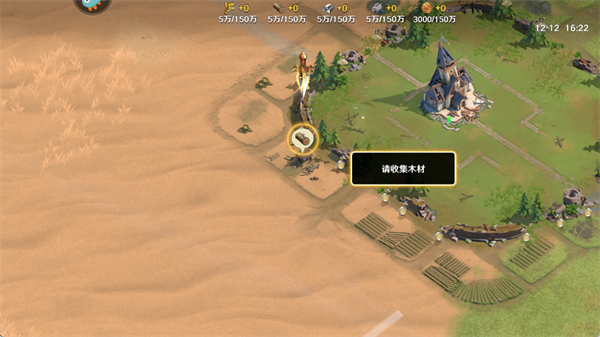 4、通过对话了解我们的城镇被攻击, 现在需要收集木材修复城墙,点击界面上的收集木材选项;