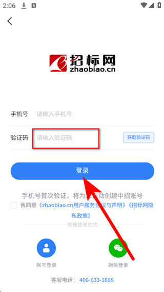4、将收到的短信验证码填入验证码栏,勾选相关协议后,点击登录,完成账号信息的绑定。