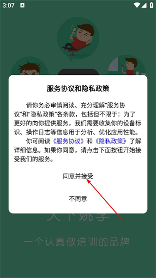 1、阅读服务协议和隐私政策后,点击同意并接受,进入应用首页。