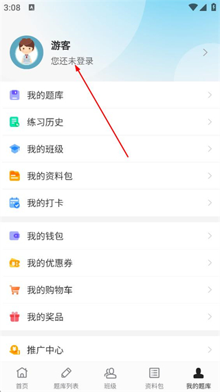 3、在我的题库页面,点击游客您还未登录区域,弹出登录选项弹窗。