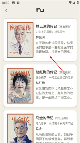 2、在侧边菜单中,点击群山选项,可进入传记列表页面。