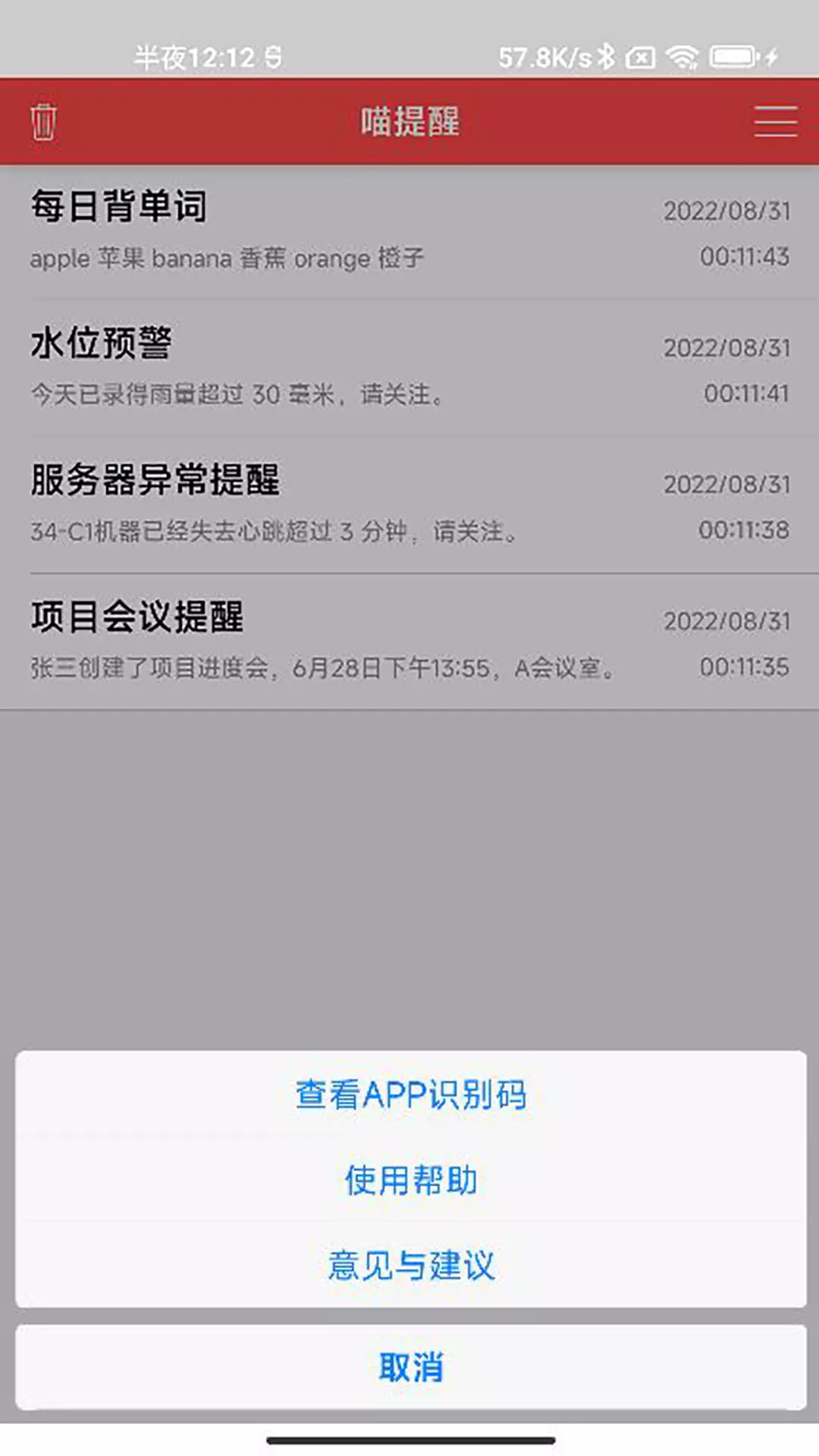 1、进入喵提醒主界面后,点击右上角菜单按钮即可展开功能列表,包括查看APP识别码、使用帮助、意见与建议及备案编号等选项。