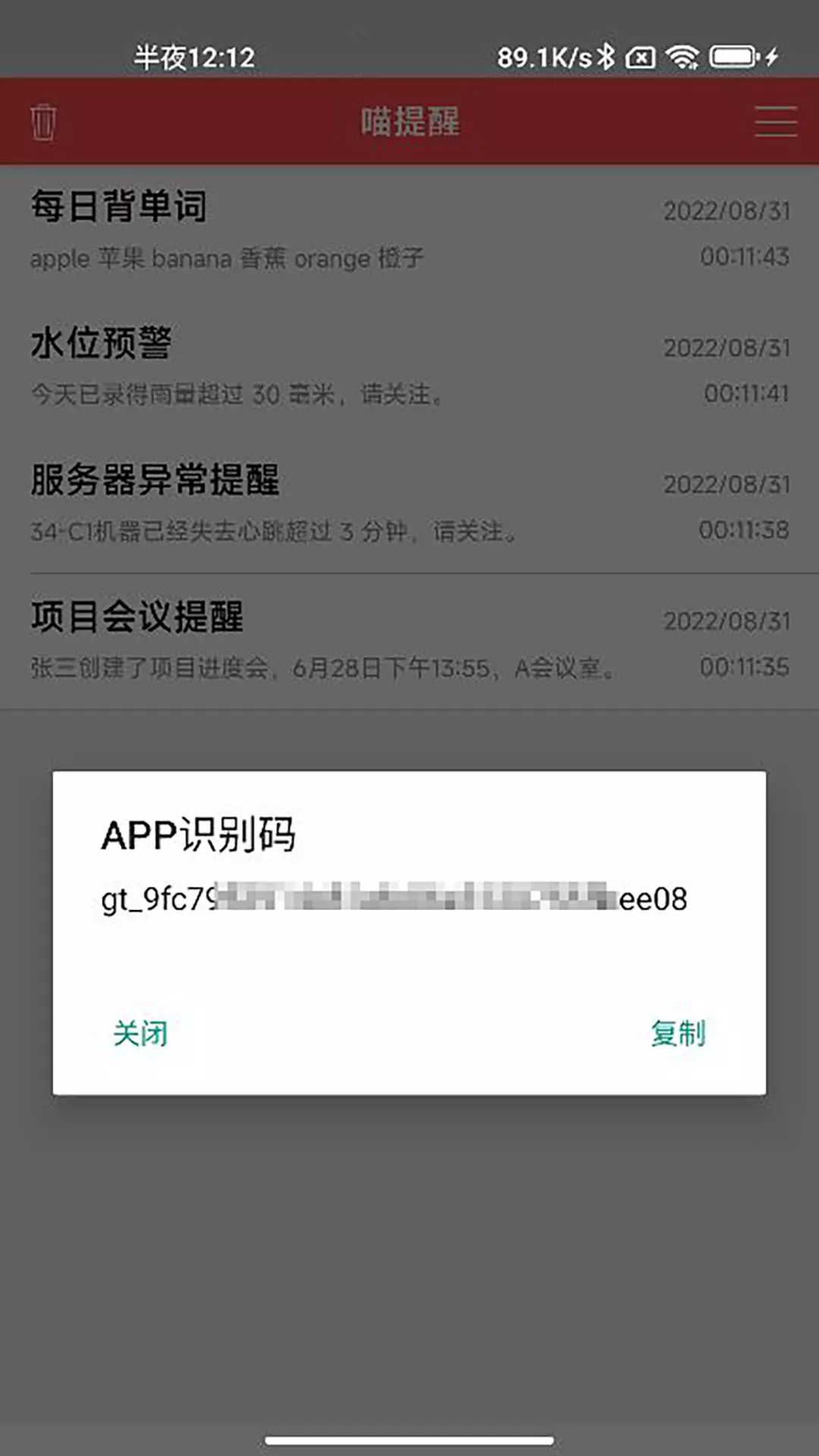 2、选择“查看APP识别码”后,可获取并复制当前应用的唯一识别码,该识别码可在绑定账号或激活功能时使用。